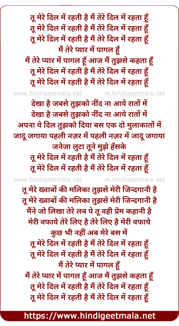 Lyrics of Tu Mere Dil Me Rehti Hai Mai Tere Dil Me Rehta Hu - तू मेरे दिल में रहती है मैं तेरे दिल में रहता हूँ