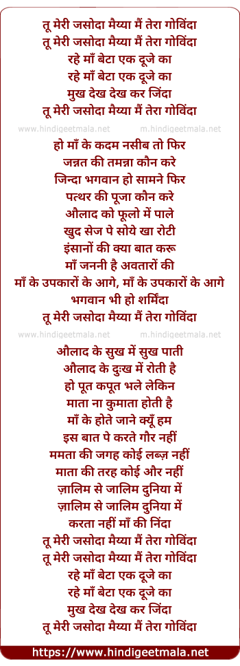 Lyrics of Tu Meri Jasoda Maiya Mai Tera Govinda - तू मेरी जसोदा मैया मैं तेरा गोविंदा