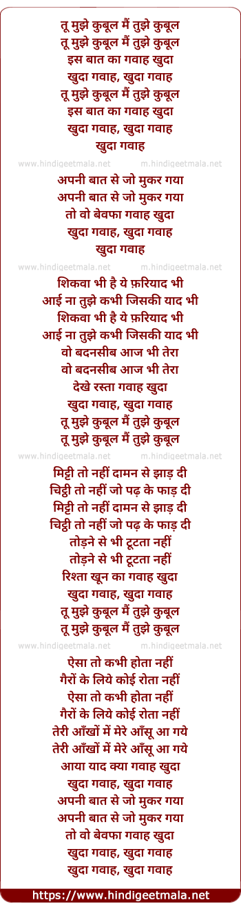 Poetic Translation - Lyrics of Tu Mujhe Kubul Main Tujhe Kubul (Female) - तू मुझे कुबूल मैं तुझे कुबूल