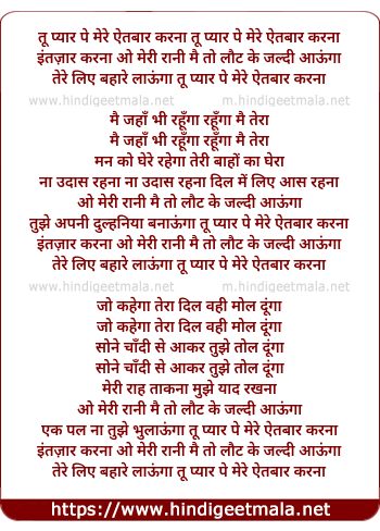 Lyrics of Tu Pyar Pe Mere Aitbar Karna - तू प्यार पे मेरे ऐतबार करना