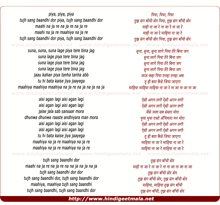 Lyrics of Tujh Sang Baandhi Dor Piya - तुझ संग बाँधी डोर पियाpiya, piya, piya