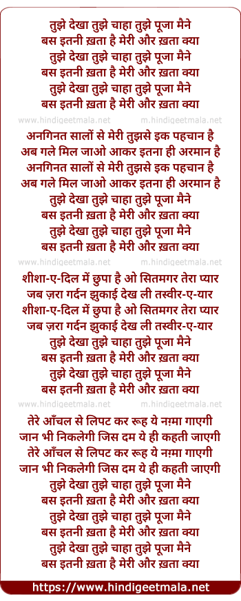 Lyrics of Tujhe Dekha Tujhe Chaha Tujhe Puja Maine - तुझे देखा तुझे चाहा तुझे पूजा मैने