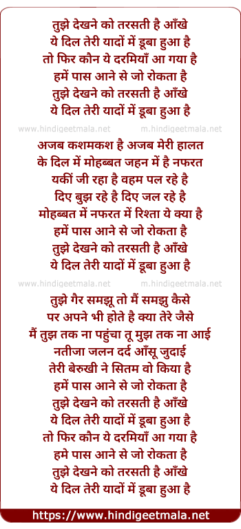 Lyrics of Tujhe Dekhne Ko Tarasti Hai Aankhe Yeh Dil - तुझे देखने को तरसती है आँखे ये दिल