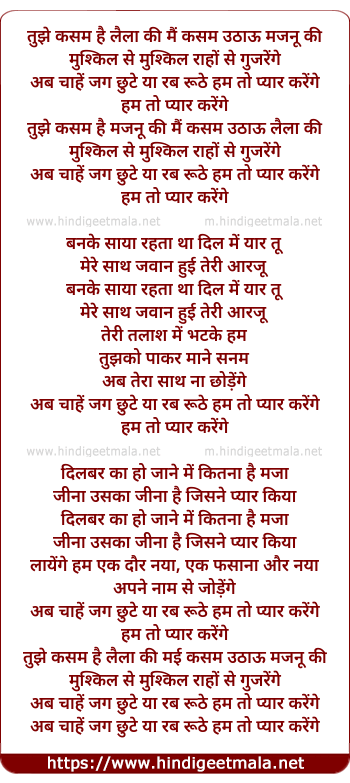 Lyrics of Tujhe Kasam Hai Laila Ki - तुझे कसम है लैला की मैं कसम उठाऊ मजनू की