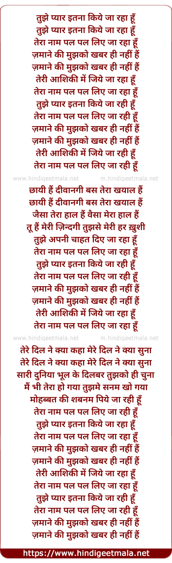 Lyrics of Tujhe Pyar Itna Kiye Ja Raha Hu - तुझे प्यार इतना किये जा रहा हूँ