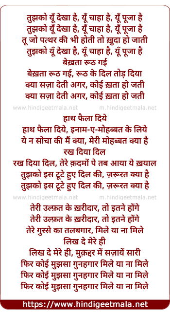 Lyrics of Tujhko Yu ,Dekha Hai - तुझको यूँ ,देखा है