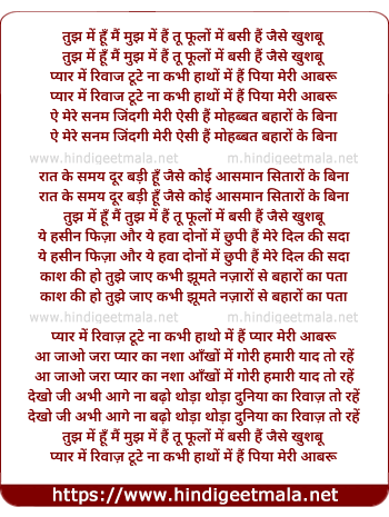 Lyrics of Tujh Me Hu Mai Mujh Me Hai Tu Phulo Me Basi Hai Jaise Khushbu - तुझ में हूँ मैं मुझ में हैं तू फूलों में बसी हैं जैसे खुशबू