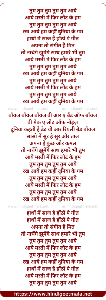 Lyrics of Tum Aaye Mastee Me Phir Laut Ke Ham - तुम आये मस्ती में फिर लौट के हम