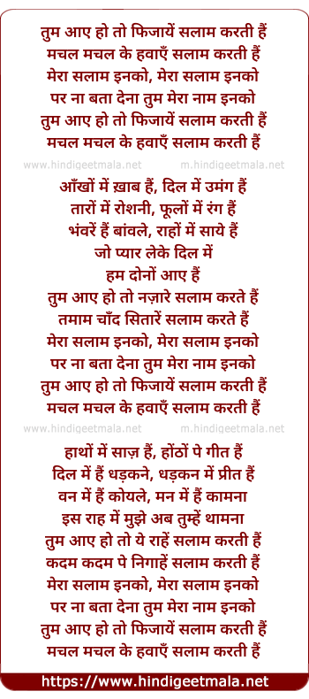 Lyrics of Tum Aaye To Fiza Ye - तुम आए हो तो फिजायें सलाम करती हैं