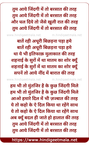 Lyrics of Tum Aaye Zindagee Me - तुम आये जिंदगी में तो बरसात की तरह