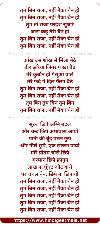 Lyrics of Tum Bin Raja Nahi Maika Chain Ho - तुम बिन राजा, नहीं मैका चैन हो