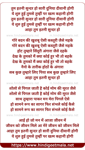 Lyrics of Tum Itni Sundar Ho Sari Duniya Diwani Hogi - तुम इतनी सुन्दर हो सारी दुनिया दीवानी होगी