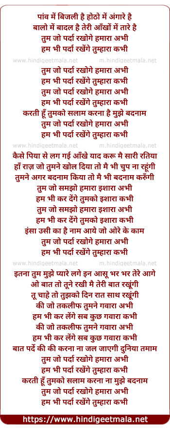 Lyrics of Tum Jo Parda Rakhoge Hamara Abhi - तुम जो पर्दा रखोगे हमारा अभी