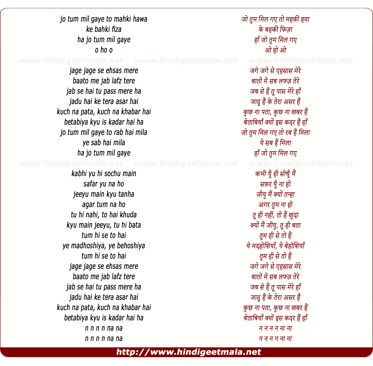 Lyrics of Tum Mil Gaye - जो तुम मिल गए तो महकी हवा