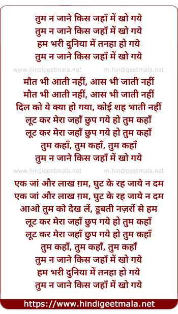 Lyrics of Tum Na Jane Kis Jahan Mein Kho Gaye - तुम ना जाने, किस जहाँ में खो गये