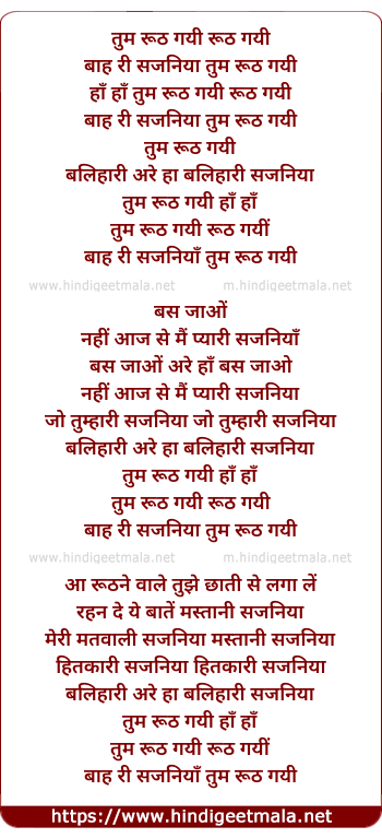 Lyrics of Tum Rooth Gayi Rooth Gayi - तुम रूठ गयी रूठ गयी