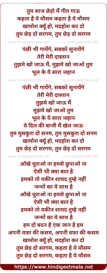 Lyrics of Tum Saaz Chedo Main Geet Gau - तुम साज छेड़ो मैं गीत गाऊ