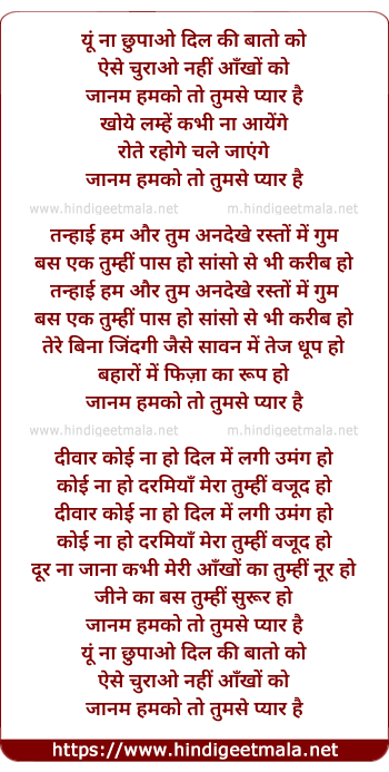 Lyrics of Tum Se Pyaar - यूं ना छुपाओ दिल की बातो को