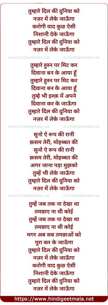 Lyrics of Tumhaare Dil Kee Duneeya Ko - तुम्हारे दिल की दुनिया को