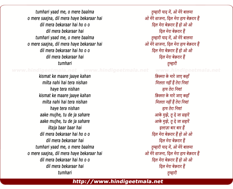 Lyrics of Tumhaaree Yaad Me Mere Balama - तुम्हारी याद में मेरे बालमाtumhari yaad me, o mere balma