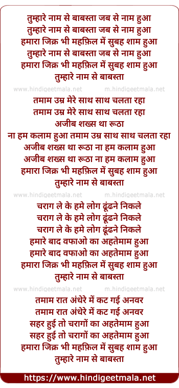 Lyrics of Tumhare Naam Se - तुम्हारे नाम से बाबस्ता जब से नाम हुआ