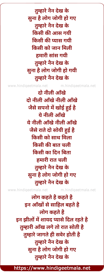 Lyrics of Tumhare Nain Dekh Ke Suna Log Jogi Ho Gaye - तुम्हारे नैन देख के सुना लोग जोगी हो गये