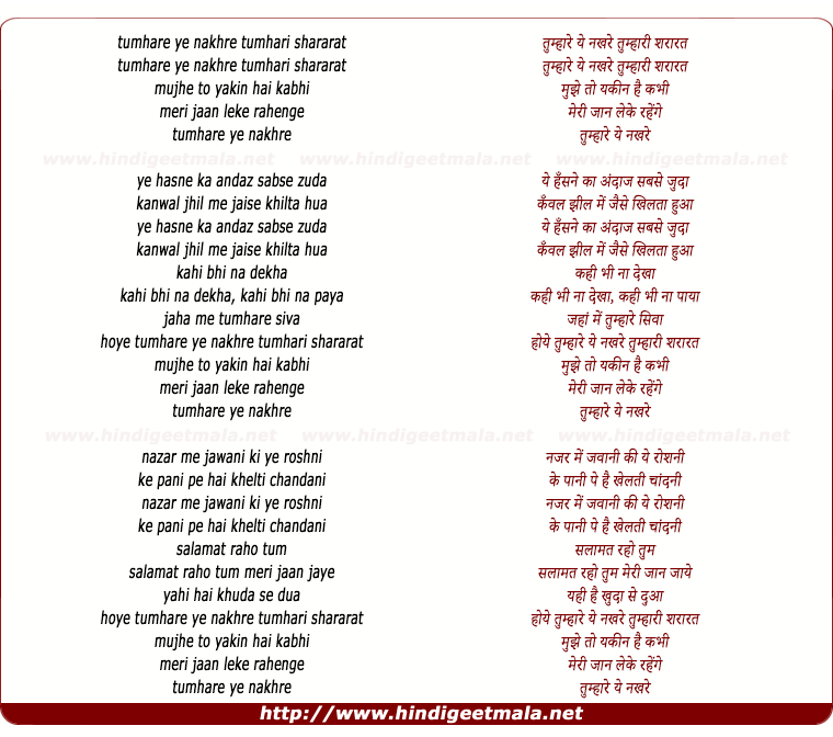 Lyrics of Tumhare Ye Nakhre Tumhari Shararat - तुम्हारे ये नखरे तुम्हारी शरारत