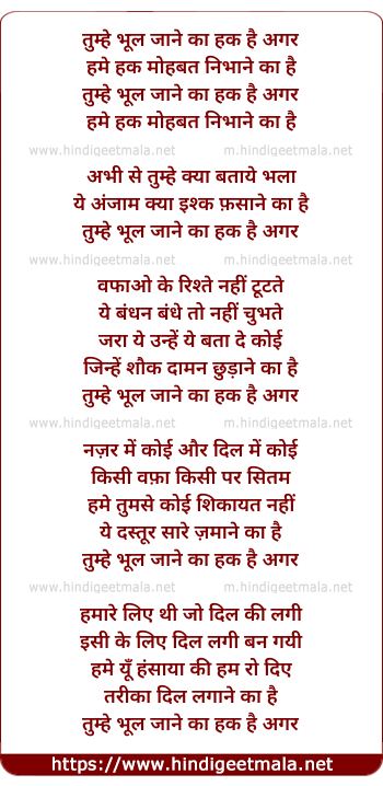 Lyrics of Tumhe Bhool Jane Kaa Haq Hai Agar - तुम्हे भूल जाने का हक है अगर