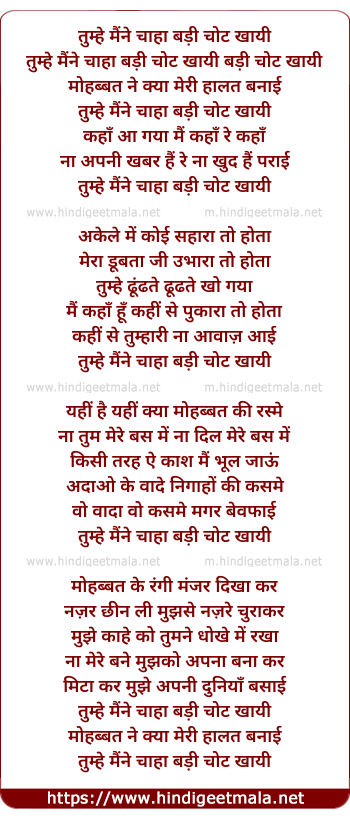 Lyrics of Tumhe Maine Chaha Badi Chot Khayi - तुम्हे मैंने चाहा बड़ी चोट खायी