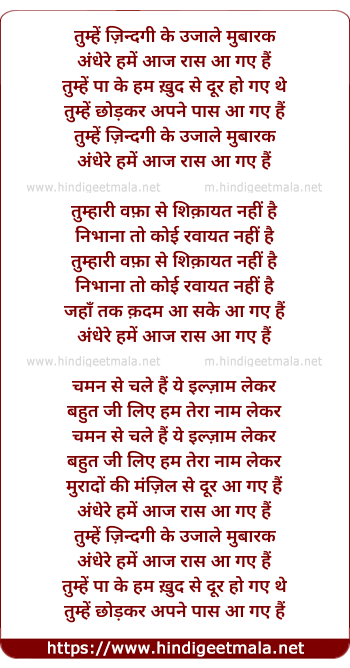 Lyrics of Tumhe Zindagi Ke Ujale Mubarak, Andhere Hume Aaj Raas Aa Gaye Hai - तुम्हें ज़िन्दगी के उजाले मुबारक, अँधेरे हमे आज रास आ गये है