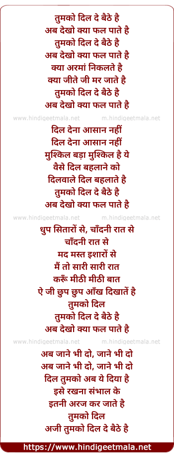 Lyrics of Tumko Dil De Baithe Hai - तुमको दिल दे बैठे है