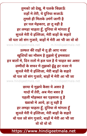 Lyrics of Tumko Jo Dekhu, Mai Palke Bichhau - तुमको जो देखू, मै पलके बिछाऊ
