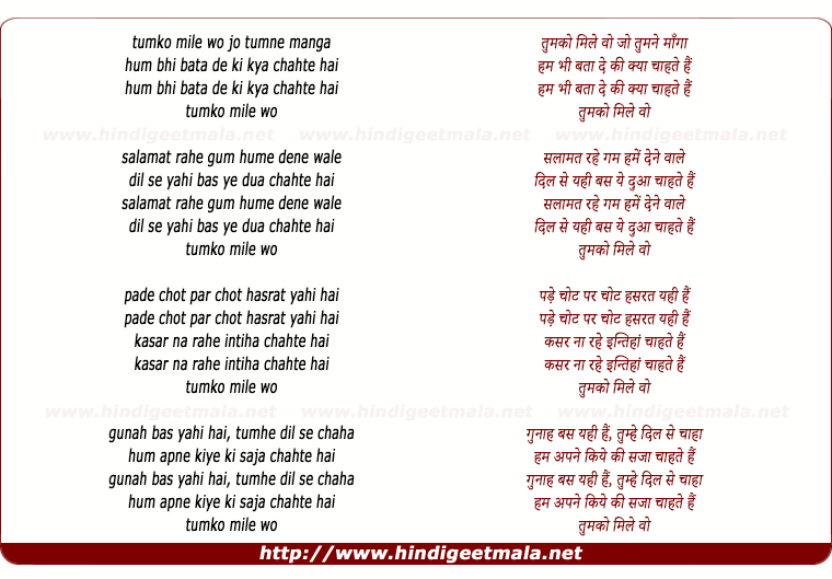 Lyrics of Tumko Mile Wo Jo Tumne Manga - तुमको मिले वो जो तुमने माँगा