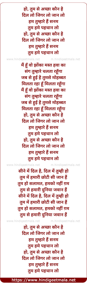 Lyrics of Tumse Achchha Kaun Hai, Dil Lo Jigar Lo Jaan Lo - तुम से अच्छा कौन है, दिल लो जिगर लो जान लो