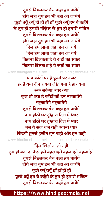 Lyrics of Tumse Bichhadke Chain Kaha Ham Payenge - तुमसे बिछड़कर चैन कहाँ हम पायेंगे