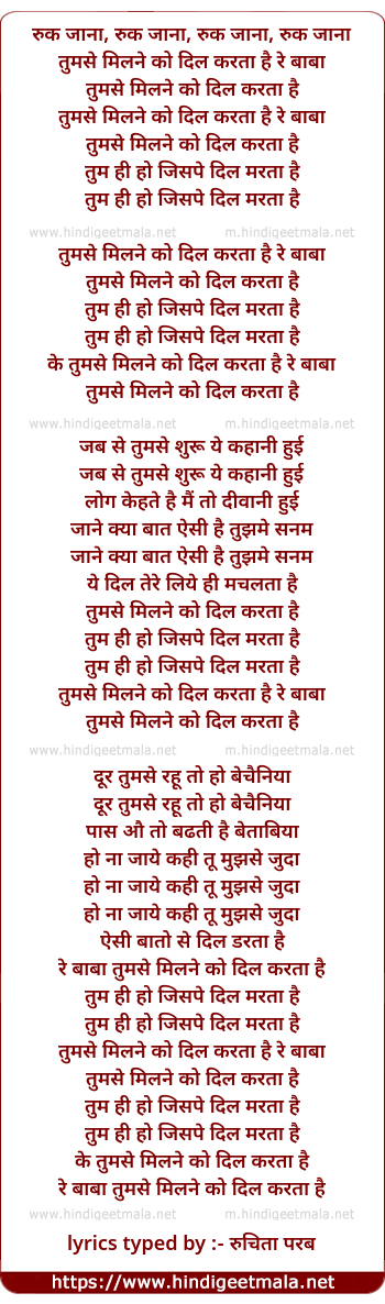 Lyrics of Ruk Jana Tumse Milne Ko Dil Karta Hai - रुक जाना तुमसे मिलने को दिल करता है