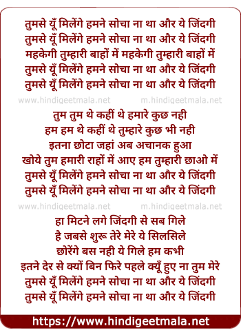 Lyrics of Tumse Yun Milenge Hamne Socha Na Tha - तुमसे यूँ मिलेंगे हमने सोचा ना था