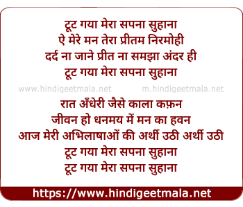Lyrics of Tut Gaya Mera Sapna Suhana - टूट गया मेरा सपना सुहाना