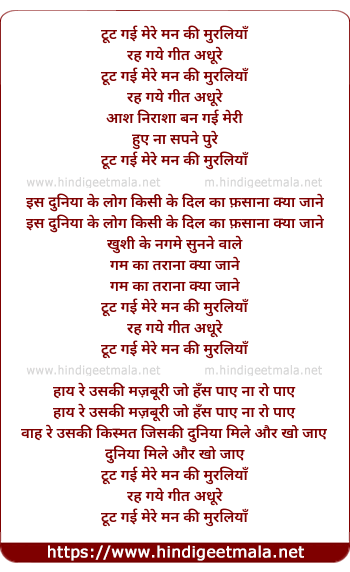 Lyrics of Tut Gayi Mere Man Ki Muraliya - टूट गई मेरे मन की मुरलियाँ
