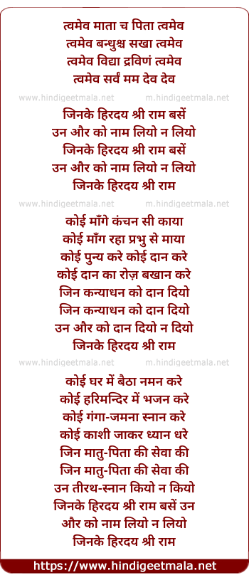 Lyrics of Tvameva Maataa, Jinake Hiraday Shri Raam Basen - त्वमेव माता च पिता त्वमेव