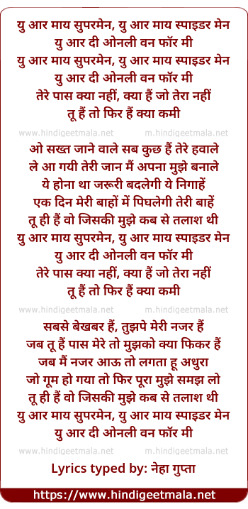 Lyrics of You Are My Superman, Tu Hai To Phir Hai Kya Kami - यु आर माय सुपरमेन, तू हैं तो फिर हैं क्या कमी