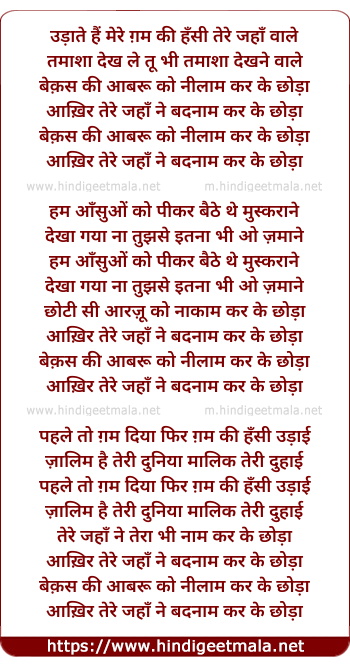 Lyrics of Udaate Hain Mere Gam Ki Hansi - उड़ाते हैं मेरे ग़म की हँसी