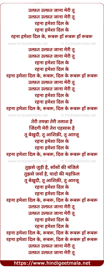 Lyrics of Ulfat Ulfat Jaana Meree Too - उल्फ़त उल्फ़त जाना मेरी तू