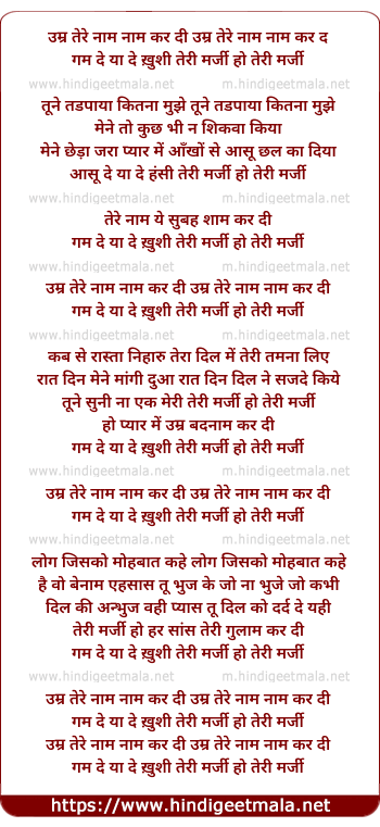 Lyrics of Umr Tere Naam Naam Kar Di (Ii)