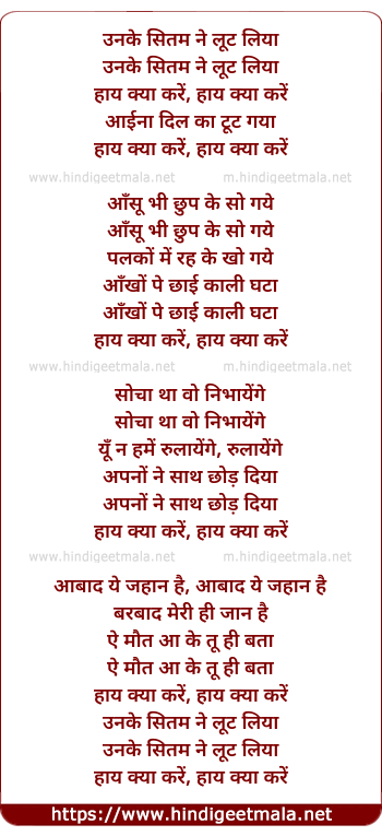 Lyrics of Unake Sitam Ne Lut Liyaa Haay Kyaa Karen - उनके सितम ने लूट लिया