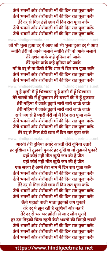 Lyrics of Unche Bhawano Aur Sheranwali Maa - ऊँचे भवनों और शेरोंवाली माँ