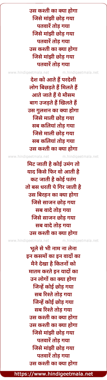 Lyrics of Us Kashti Ka Kya Hoga Jise Manjhi Chhod Gaya - उस कश्ती का क्या होगा जिसे मांझी छोड़ गया
