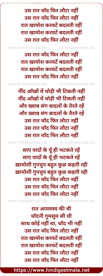 Lyrics of Us Raat Chand Fir Lauta Nahi - उस रात चाँद फिर लौटा नहीं