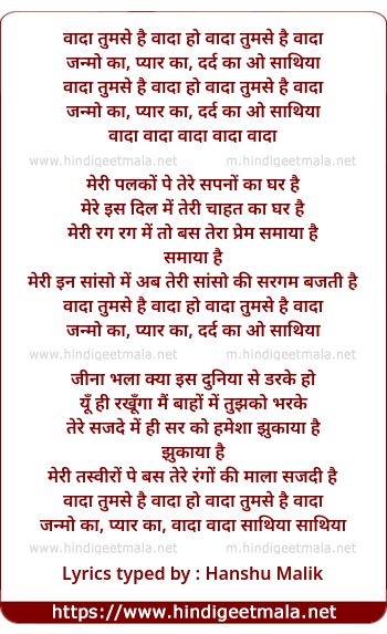 Lyrics of Vaada Tumse Hai Vaada - वादा तुमसे है वादा