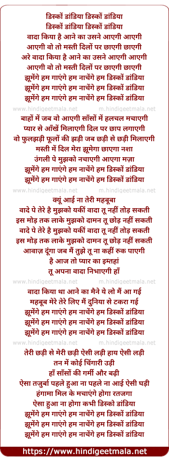 Lyrics of Vaadaa Kiyaa Hai, Naachenge Ham Disco Daandiyaa - वादा किया है ,नाचेंगे हम डिस्कों डांडिया